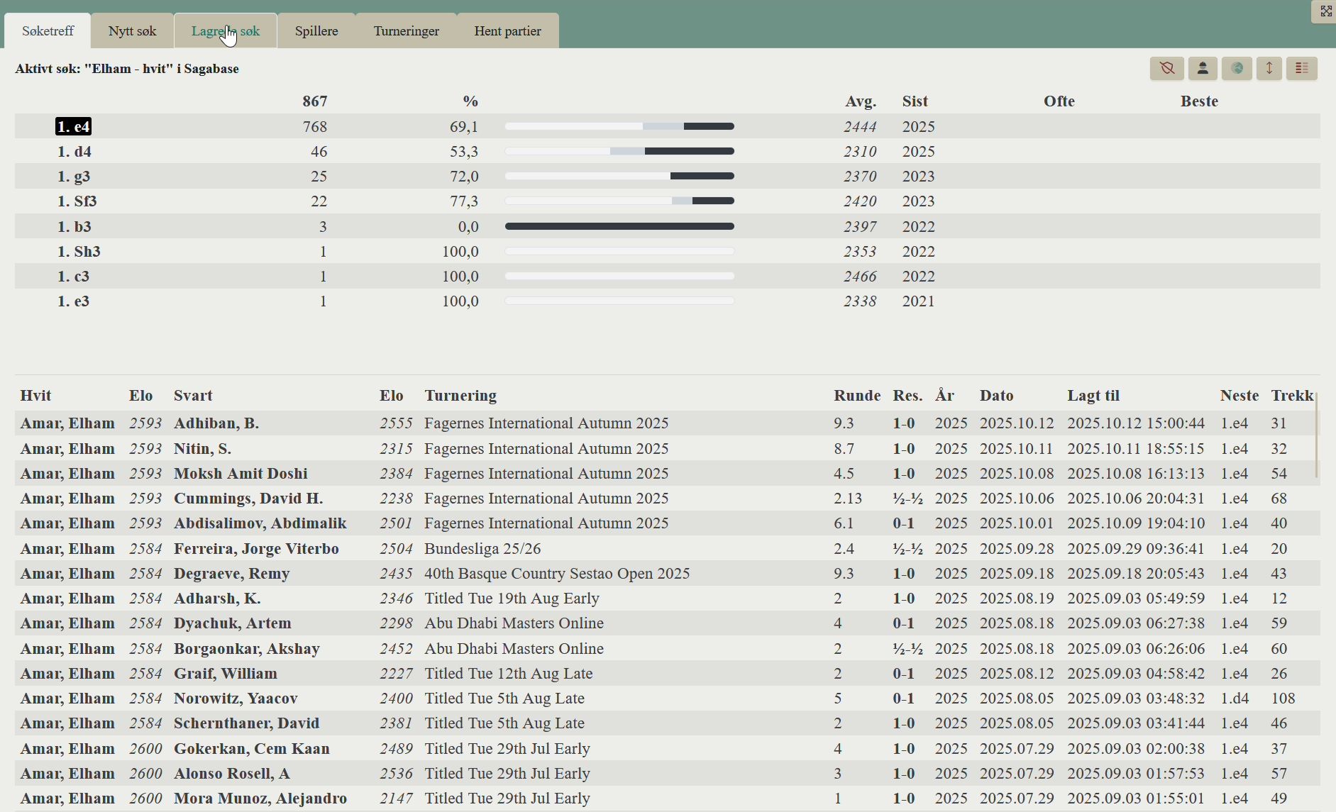 Sagabase inneholder over ti millioner turneringspartier og oppdateres daglig, faktisk minutter etter at noen partier er ferdig spilt. Jeg har laget en enkel video som forklarer hvordan du gjør et søk på et navn og hvordan du lagrer søket slik at du kan bruke det senere.