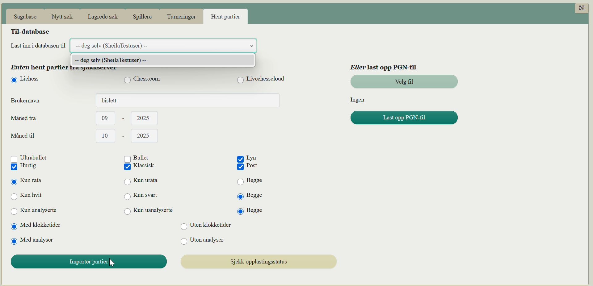 Du har ditt eget personlinge arbeidsområde på sjakkSheila som ingen andre har tilgang til. :-) Der kan du laste inn egne pgn-er og du kan, som jeg viser i denne videoen, laste inn partier spilt av et brukernavn på Lichess eller chess.com.